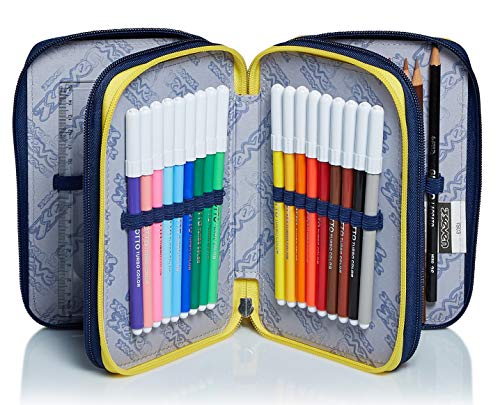 Astuccio 3 Scomparti Seven, Check, Blu, Completo di matite, penne, pennarelli