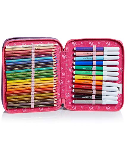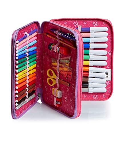 DIMENSIONI: 25 x 19 x 5 cm CONTENUTO: 1 penna cancellabile Pilot Frixion blu, 1 penna a sfera Fila rosso, 18 pennarelli Giotto Turbocolor, 12 pennarelli Giotto Turbomaxi, 24 pastelli a colori Giotto Supermina, 1 matita grafite Lyra, 1 colla stick Pritt, 1 gomma, 1 temperino, 1 righello trasparente, 1 goniometro trasparente, 1 forbice in metallo con maniglia in plastica CARATTERISTICHE: 2 scomparti con zip. Elastici interni per sotenere il contenuto. TESSUTO: Poliestere