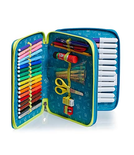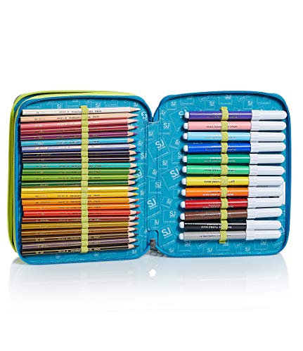 DIMENSIONI: 25 x 19 x 5 cm CONTENUTO: 1 penna cancellabile Pilot Frixion blu, 1 penna a sfera Fila rosso, 18 pennarelli Giotto Turbocolor, 12 pennarelli Giotto Turbomaxi, 24 pastelli a colori Giotto Supermina, 1 matita grafite Lyra, 1 colla stick Pritt, 1 gomma, 1 temperino, 1 righello trasparente, 1 goniometro trasparente, 1 forbice in metallo con maniglia in plastica CARATTERISTICHE: 2 scomparti con zip. Elastici interni per sotenere il contenuto. TESSUTO: Poliestere