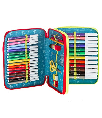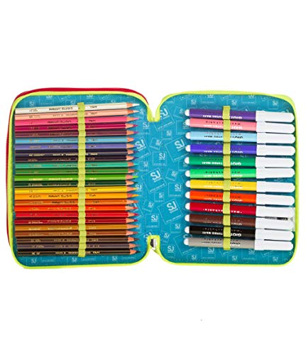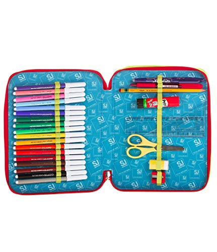 DIMENSIONI: 25 x 19 x 5 cm ALTRE CARATTERISTICHE:CONTENUTO: 1 penna a sfera cancellabile , 1 penna a sfera rossa, 1 matita, 1 gomma, 1 temperino, 1 righello, 1 goniometro, 1 forbice, 1 penna a sfera, 1 colla, 24 pastelli, 18 pennarelli,12 pennarelli Maxi. TASCHE:
