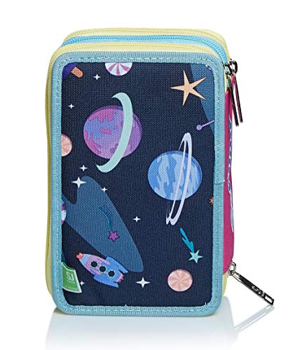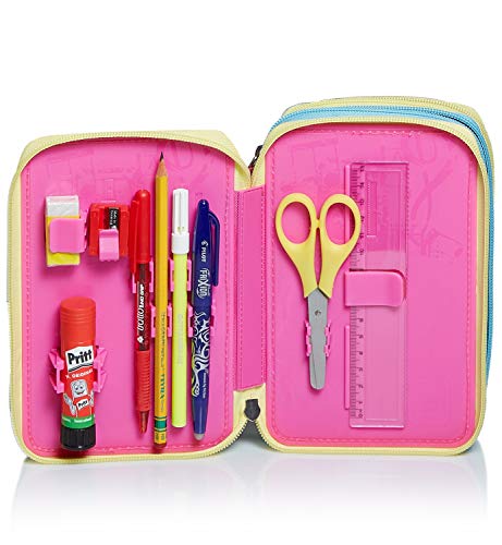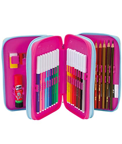 DIMENSIONE: 20×12,5×7 cm CARATTERISTICHE: CONTENUTO: 1 penna cancellabile blu, 18 pastelli a colori, 18 pennarelli, 1 colla stick, 1 penna rossa, 1 matita, 1 gomma, 1 temperino, 1 righello, 1 forbice. ALTRE CARATTERISTICHE: Incastri rigidi ma maneggevoli al posto degli elastici. Lavabile.