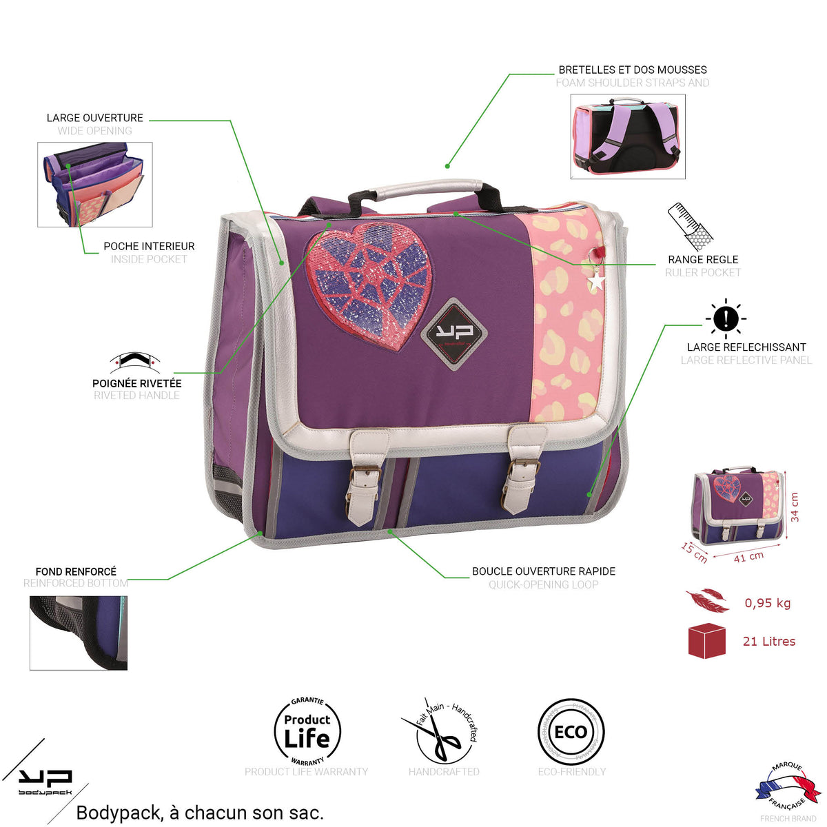 Ha 3 scomparti, lo schienale e spalline imbottiti, la chiusura con 2 fibbie, e 2 ampie tasche. Inoltre ha parti riflettenti, etichetta porta nome, fondo rinforzato e il cuore di paillettes.