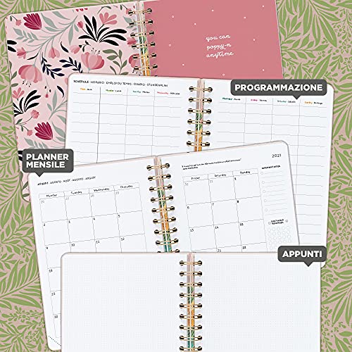 Il diario agenda scuola 2021 2022 è un prodotto dal design unico e di tendenza, indispensabile per pianificare al meglio le attivitá quotidiane. Dal carattere versatile, si adatta perfettamente alle esigenze di grandi e piccini, grazie alla sua struttura che include, oltre al layout settimanale da agosto 2021 a luglio 2022, diversi spazi extra per l’organizzazione: calendario annuale, pianificazione oraria, planner mensile e spazio per appunti. Le sue dimensioni compatte di 21×14,8 cm lo rendono facile da trasportare, la rilegatura a spirale wire-o facile da usare, la copertina rigida e la chiusura con fascia elastica affidabile e resistente, per tenere sempre a salvo le sue pagine. Presenta 176 pagine di 100 gr, con angoli microforati da staccare, per sapere sempre in che settimana dell’anno ci si trova. Inoltre dispone di due pagine di adesivi stickers per personalizzare le sue pagine, ed una tasca espandibile nella parte posteriore per guardare biglietti, ricevute, polaroid, etc. Editato in italiano, inglese, spagnolo, francese e tedesco.
