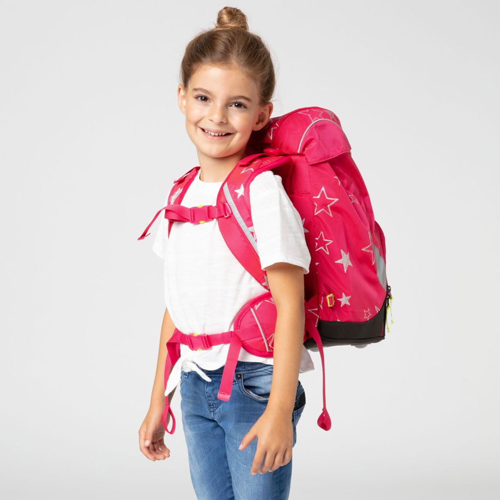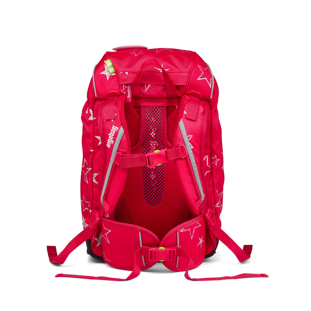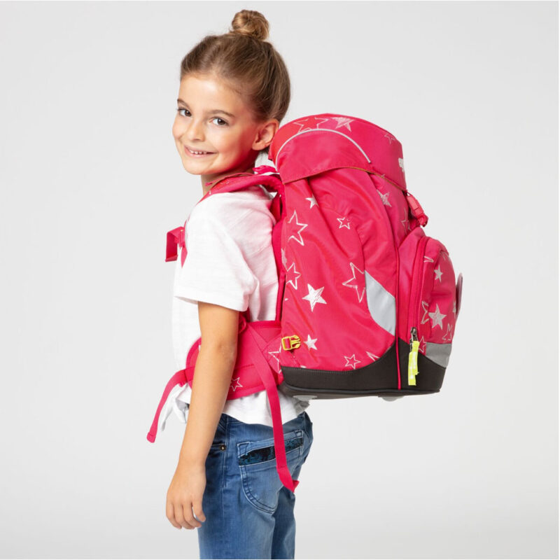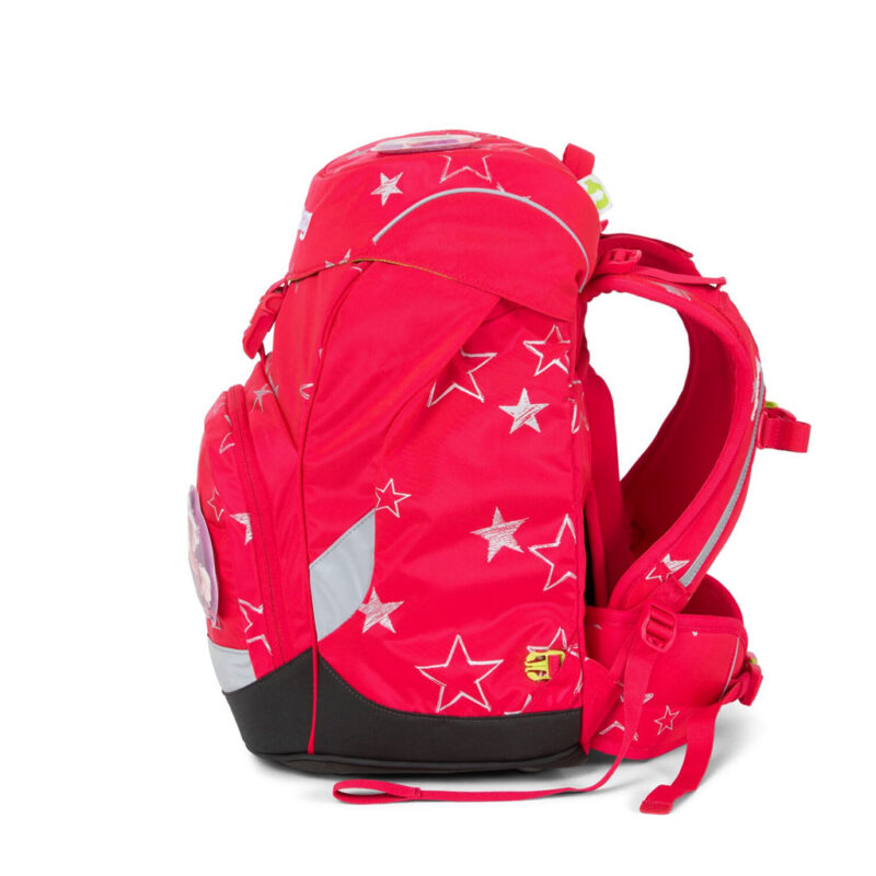 Lo zaino Ergobag Prime Cinbearella ha colori brillanti e stampe con stelle. E’ realizzatao con 17 bottiglie in PET riciclate, quindi è completamente ecologico.