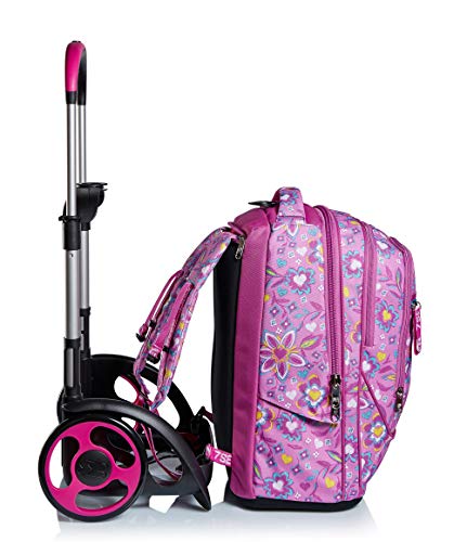 TASCHE: Doppia tasca frontale. SCHIENALE: Imbottito e rivestito in tessuto SPALLACCI: Imbottiti e rivestiti in tessuto. CROSSOVER SYSTEM: i ganci sollevano gli spallacci quando usato come trolley.
