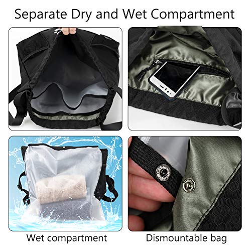 【Design Tascabile Ragionevole e Facile da Pulire】 ha uno scomparto impermeabile rimovibile all’interno dello zaino per riporre costumi da bagno bagnati, asciugamani, articoli da toeletta, ecc., In particolare un altro scomparto separato nella parte inferiore può contenere palloni da calcio o scarpe . che è molto utile per separarli dalle altre cose all’interno dello zaino.
