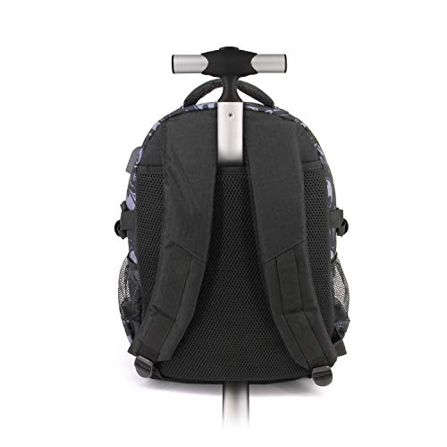 Zaino con tre scomparti chiusi con cerniera Fodera interna con tasca per dispositivi elettronici Porta USB per ricarica cellulare (power bank non inclusa) Dorso imbottito traspirante con cinturino posteriore per trattenere il trolley Dimensioni: 44 x 30 x 17cm
