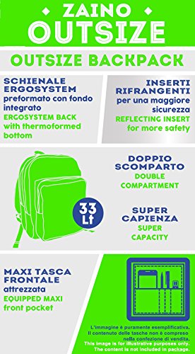 DIMENSIONI: 43x31x21 cm; : 33 LT SPALLACCI: Imbottiti e rivestiti su pezza, traspirante come regola SOFT FOAM. SCHIENALE: Ergosystem preformato ALTRE CARATTERISTICHE:Inserti rifrangenti tra una connivenza a 360°. Simulato scomparto. TASCHE: Maxi frontale attrezzata.