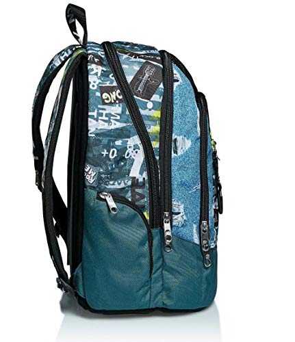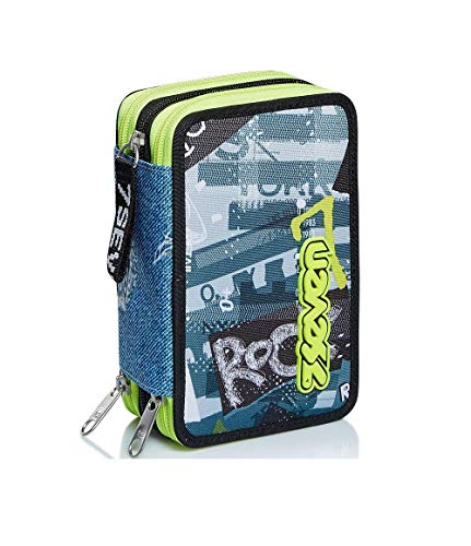 SCHOOLPACK ZAINO SEVEN ADVANCED Zaino con fantasia urban rock colore nero e celeste. Presenta un ampio doppio scomparto in cui puoi distribuire il carico in maniera ottimale fruttando anche le tasche laterali e quella frontale con organizer, In più ha una tasca per portare con se il tablet o il PC e con la funzione selfie remote control potrai divertirti a fare selfie dove vuoi tu. Lo schienale Ergosystem preformato con fondo integrato e gli spallacci imbottiti e traspiranti lo rendono leggero e confortevole da indossare, proteggendoti la schiena. E con gli inserti rifrangenti sarai più visibile per la tua sicurezza. DIMENSIONI: 31 x 43 x 24 cm CAPACITA’: 30 LT + ASTUCCIO 3 ZIP SEVEN CONTENUTO: 1 penna cancellabile Pilot Frixion blu, 18 pastelli a colori Giotto Supermina, 18 pennarelli Giotto Turbocolor, 1 colla stick Pritt, 1 penna Fila rossa, 1 evidenziatore Fila Turbofluo, 1 matita Lyra Temagraph, 1 gomma, 1 temperino, 1 righello, 1 goniometro, 1 forbice. TASCHE: 3 Scomparti con zip. ALTRE CARATTERISTICHE: Tessuto glitterato. Divisori in plastica per la sicurezza del contenuto e maggiore praticità. Dimensioni 19,5 x 12,5 cm x 7 cm circa