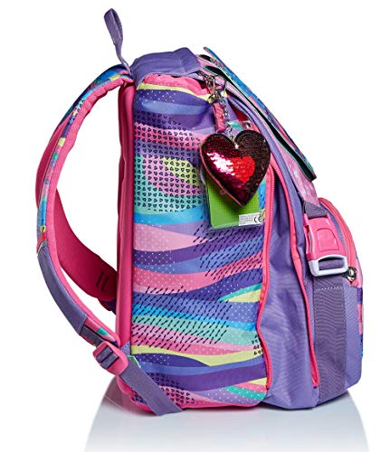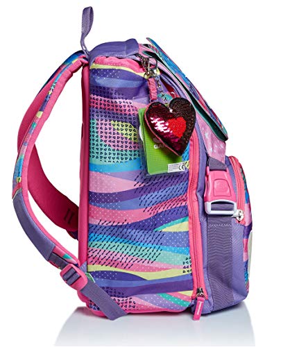 DIMENSIONI: Chiuso: 27 x 41 x 16 Cm ; Aperto: 27 x 41 x 22 Cm; CAPACITA’: 28 LT CARATTERISTICHE: Zaino estensibile con zip laterale. Inserti rifrangenti per protezione a 360°. Sistema “FLIP SYSTEM” con 3 pattine sfogliabili calamitate con diverse fantasie. Set 10 cards con bustina con occhi e charm imbottito con moschettone. Chiusura: Cerniera Zainetto per bambini TASCHE: Tasca frontale. Tasca su pattina. SCHIENALE: Ergosystem preformato con fondo integrato. SPALLACCI: Regolabili, imbottiti e rivestiti in tessuto e rete traspirante TESSUTO: Poliestere