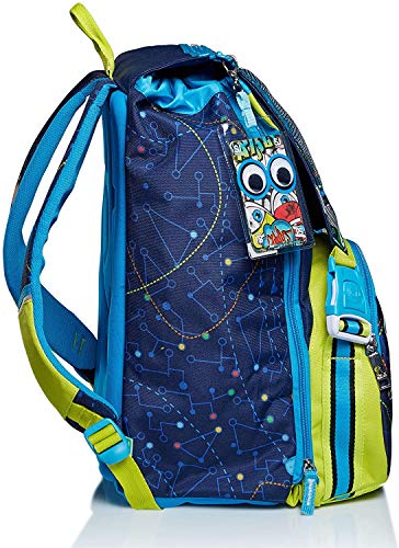 Zaino estensibile con pattina staccabile con inserto luminoso in fibre ottiche su pattina. Set 10 cards con bustina con occhi, inserti rifrangenti e inserti olografici. TASCHE: Tasca frontale. Tasca su pattina. SCHIENALE: Ergosystem preformato con fondo integrato. SPALLACCI: Regolabili, imbottiti e rivestiti in tessuto e rete traspirante