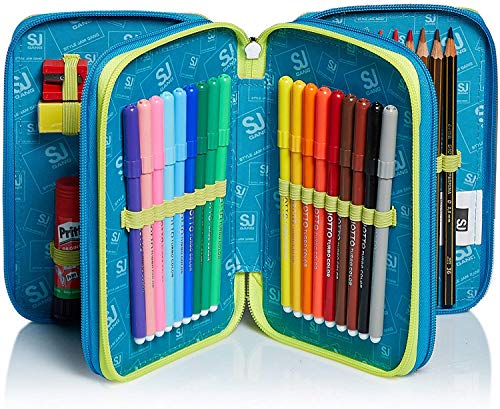 Contenuto astuccio: 1 penna cancellabile Pilot Frixion blu, 1 penna a sfera Fila rosso, 18 pennarelli Giotto Turbocolor, 18 pastelli a colori Giotto Supermina, 1 matita grafite Lyra, 1 colla stick Pritt, 1 gomma, 1 temperino, 1 righello trasparente, 1 goniometro trasparente, 1 forbice in metallo con maniglia in plastica